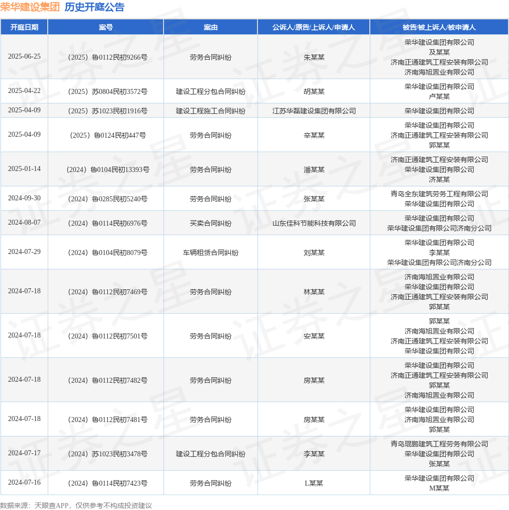 案号:(2025)鲁0112民初9266号审理法院:济南市历城区人民法院案由:劳务合同纠纷当事人信息: 原告/上诉人:朱某某 被告/被上诉人:荣华建设集团有限公司、及某某、济南正通建筑工程安装有限公司、济南海旭置业有限公司开庭日期:2025年6月25日根据统计,近一年内以荣华建设集团有限公司为当事人的历史开庭公告有14则,其中案由为“劳务合同纠纷”的公告以9则居首,其次为“建设工程分包合同纠纷”有2则,“买卖合同纠纷”有1则。历史开庭公告如下: