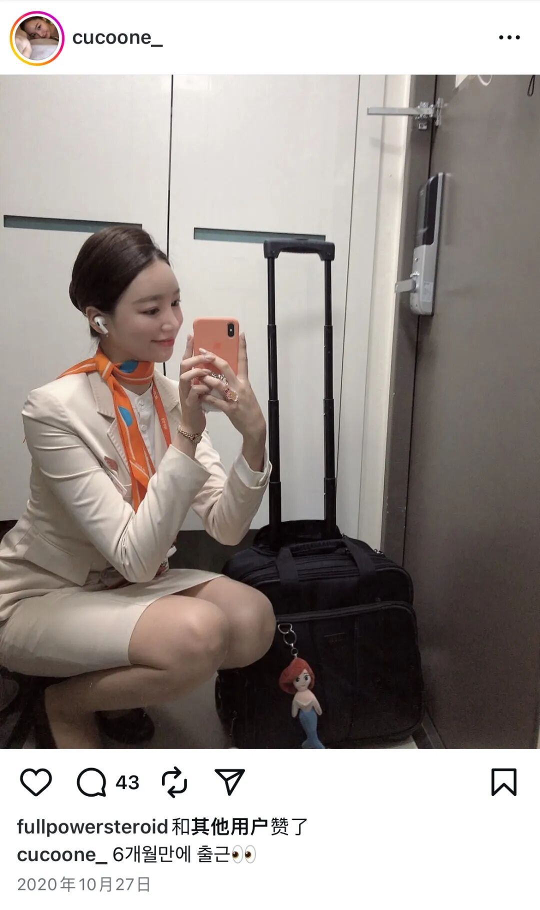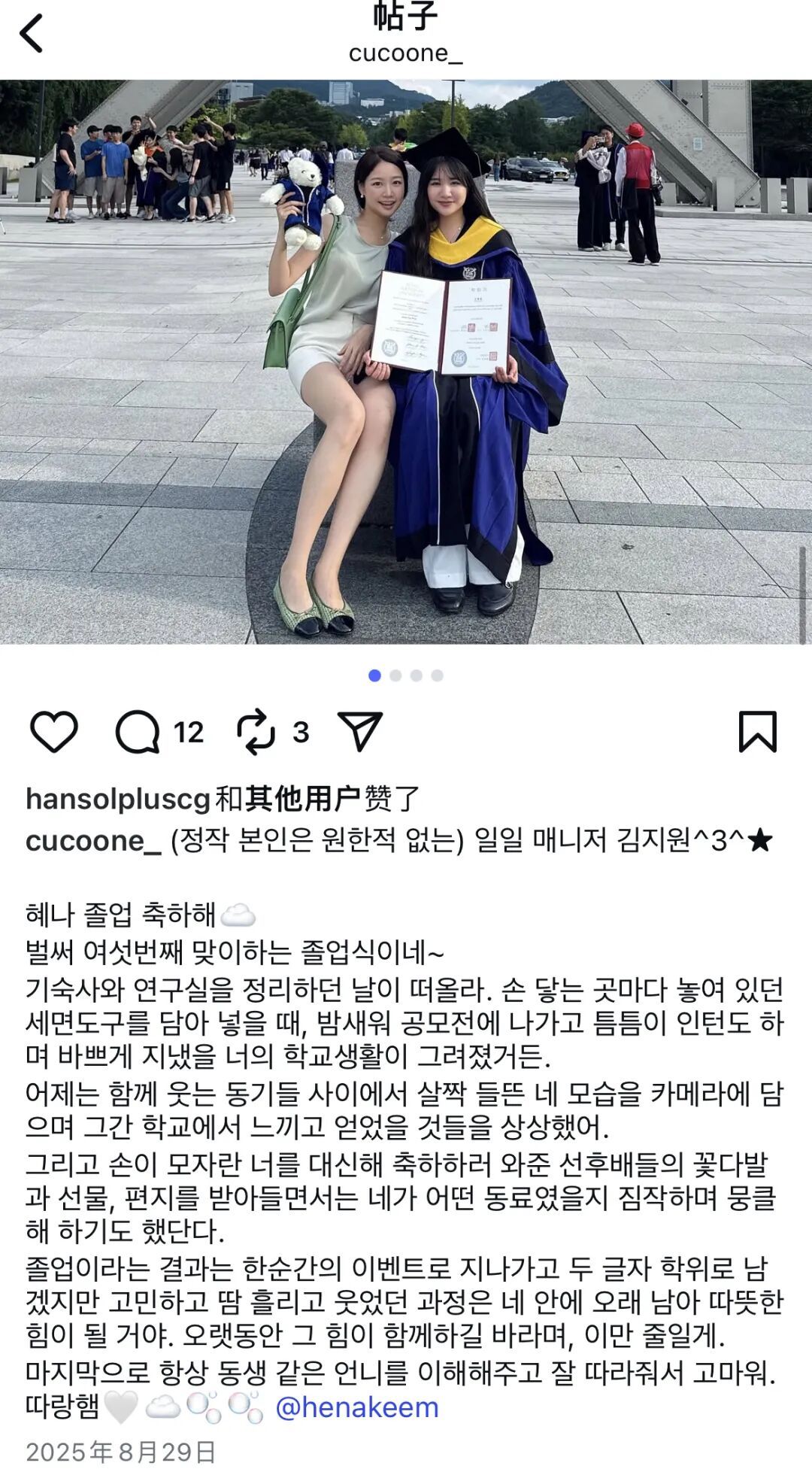 在Instagram上,Sophie拥有两万多名粉丝。在日常分享中,点赞最高的帖子是她去首尔大学参加妹妹的毕业典礼,还有她以前当乘务员时穿制服的照片。此外,她还经常分享自己做料理、看展、读书的日常,周围人形容她过着갓생(god生)一样的生活。