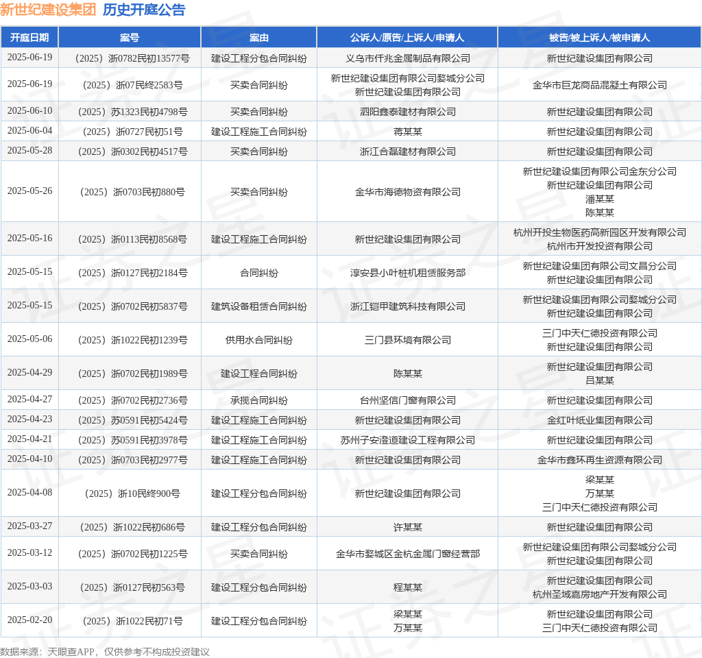 案号:(2025)浙0782民初13577号审理法院:义乌市人民法院案由:建设工程分包合同纠纷当事人信息: 原告/上诉人:义乌市仟兆金属制品有限公司 被告/被上诉人:新世纪建设集团有限公司开庭日期:2025年6月19日根据统计,近一年内以新世纪建设集团有限公司为当事人的历史开庭公告有86则,其中案由为“买卖合同纠纷”的公告以23则居首,其次为“建设工程施工合同纠纷”有16则,“建筑设备租赁合同纠纷”有15则。历史开庭公告(前20条)如下: