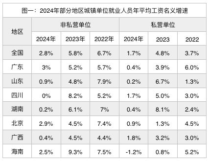 如图一,2024年多个省份非私营、私营单位平均工资涨幅相较此前两年出现了较大程度下滑。在非私营单位平均工资方面,有4个省份增速降至1%以下,其余20省份增速均在4%及以下。其中,四川为零增长,而2023年的增速为8.2%;在私营单位平均工资方面,有6个省份增速降至1%以下。其中,海南同比下降1.2%。