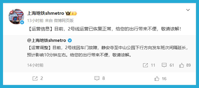 上海地铁官方微博昨天晚上8时36分发布消息:2号线因车门故障上海配资,静安寺至中山公园下行方向发车班次间隔延长。随后,官方微博于8时52分更新消息。昨晚9时18分,2号线运营已恢复正常。