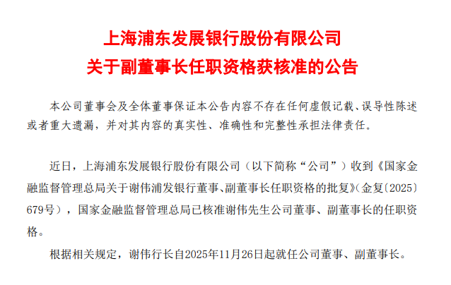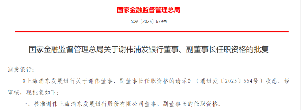 近日,国家金融监督管理总局发布任职批复称,核准谢伟浦发银行(600000)董事、副董事长的任职资格。
